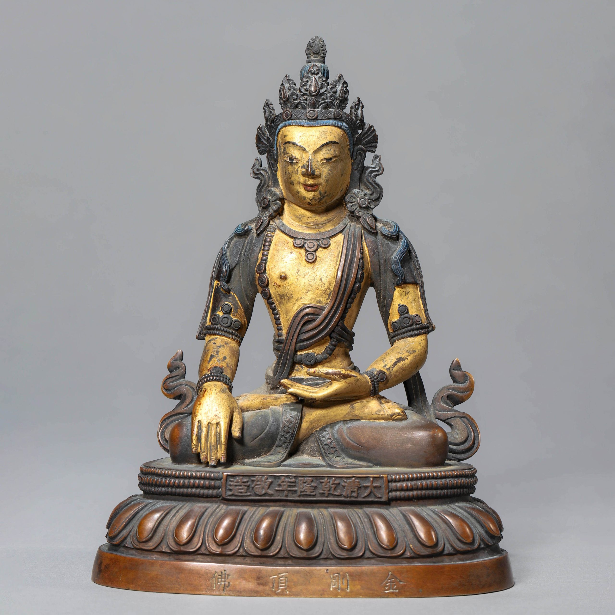 Qing Dynasty Qianlong Period Copper and Gilt-Decorated Buddha Statue with Steel Cap