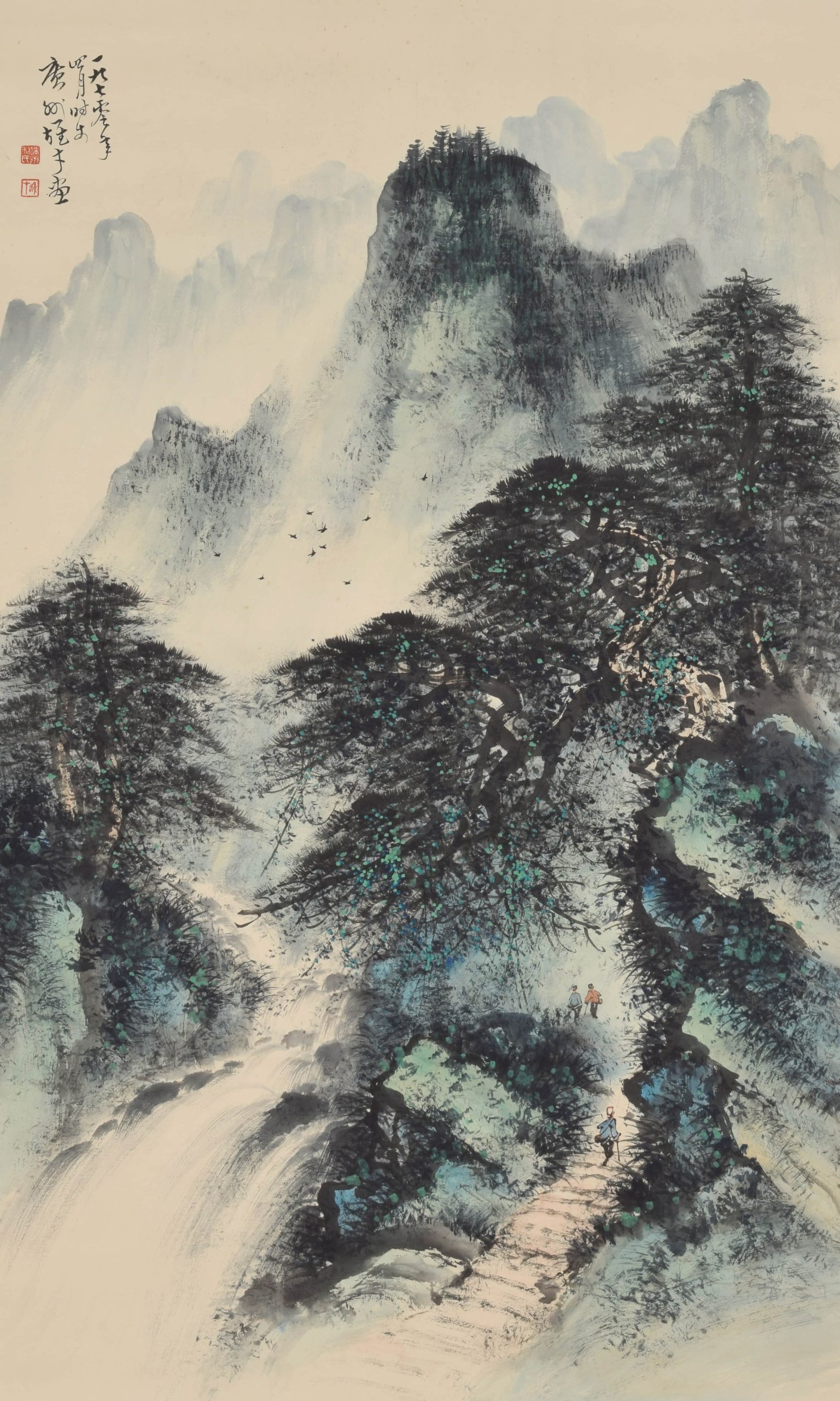 LI XIONGCAI (1910-2000) – CLIMBING THE MOUNTAIN IN COLORS ON PAPER, HANGING SCROLL