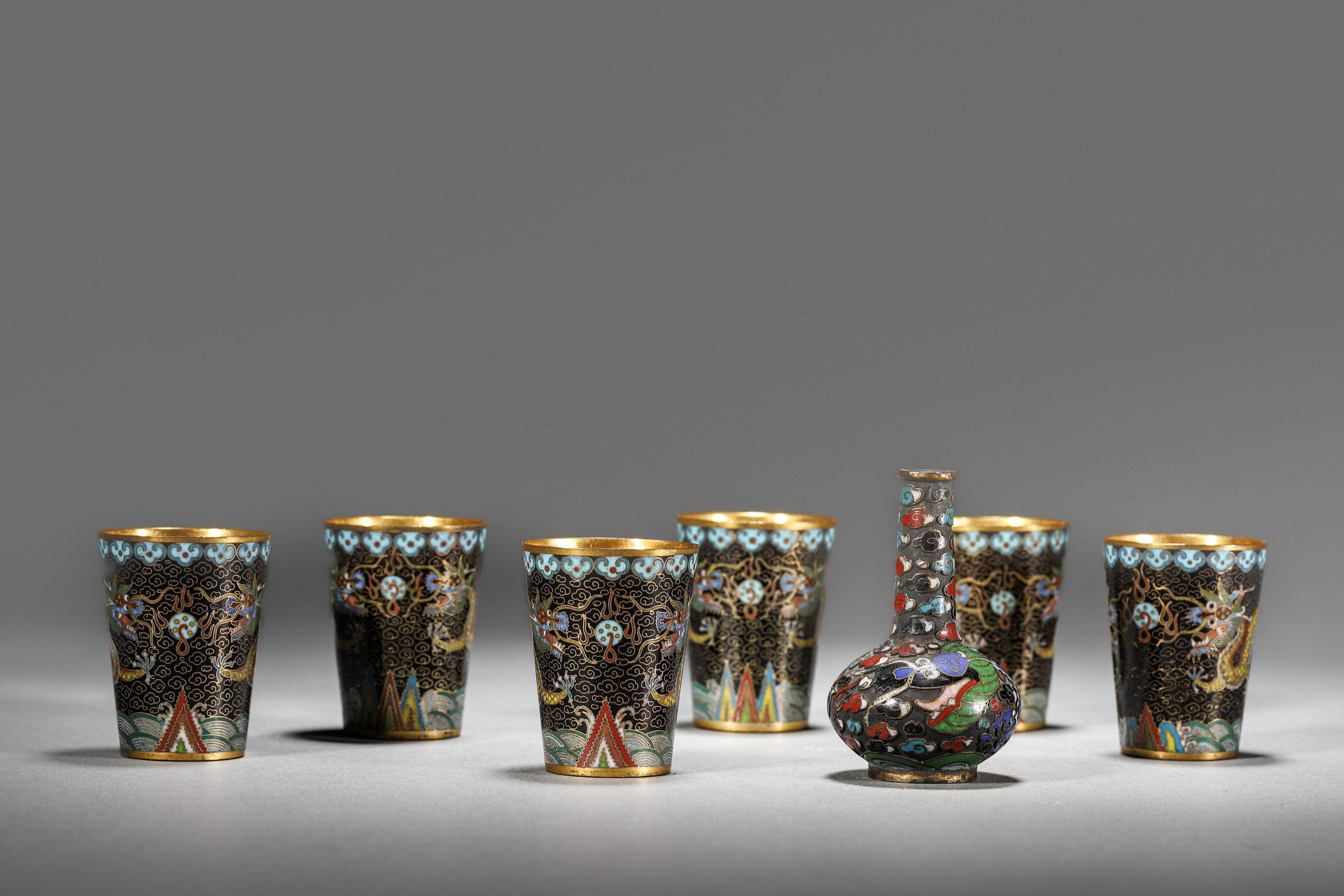 A pair of Chinese copper-based cloisonné cups and copper-based cloisonné celestial globe vases.