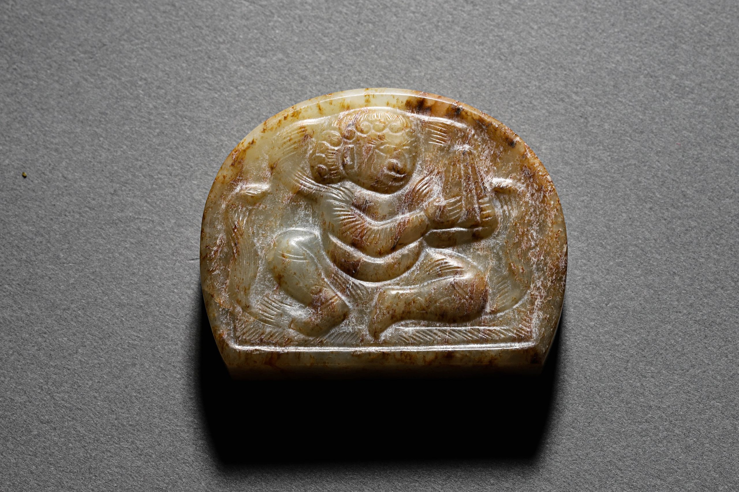 A Chinese jade relief decoration featuring a foreigner presenting treasures