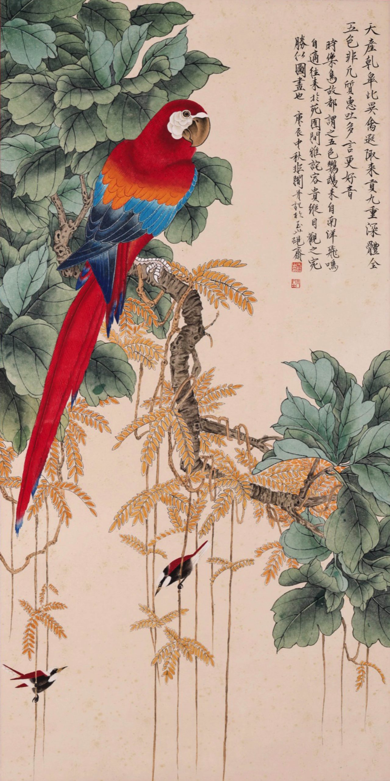 A Chinese vertical hanging scroll painting of a parrot by Yu Feian (1895-1950) Mark.