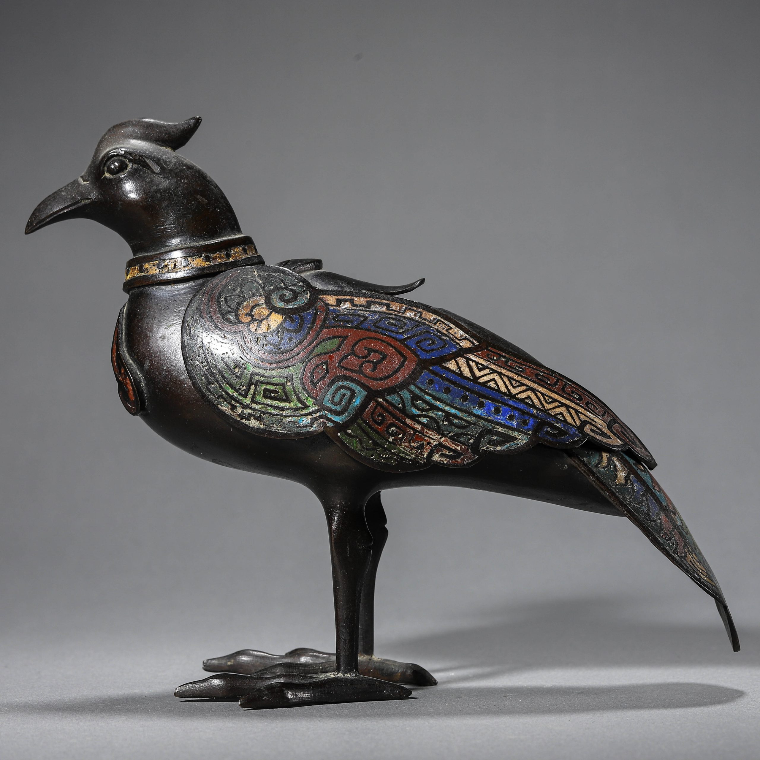 A CHINESE BRONZE PAINTED BIRD INCENSE BURNER, POSSIBLY MING DYNASTY, 16TH CENTURY.