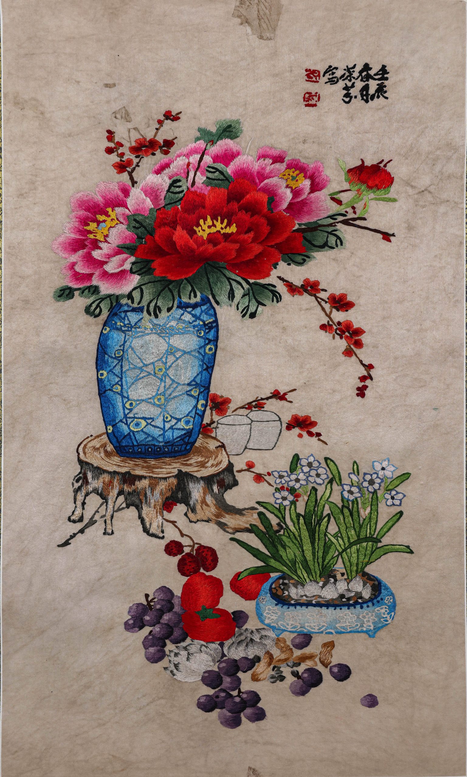A CHINESE EMBROIDERED STILL LIFE PANEL, POSSIBLY QING DYNASTY, 18TH–19TH CENTURY.