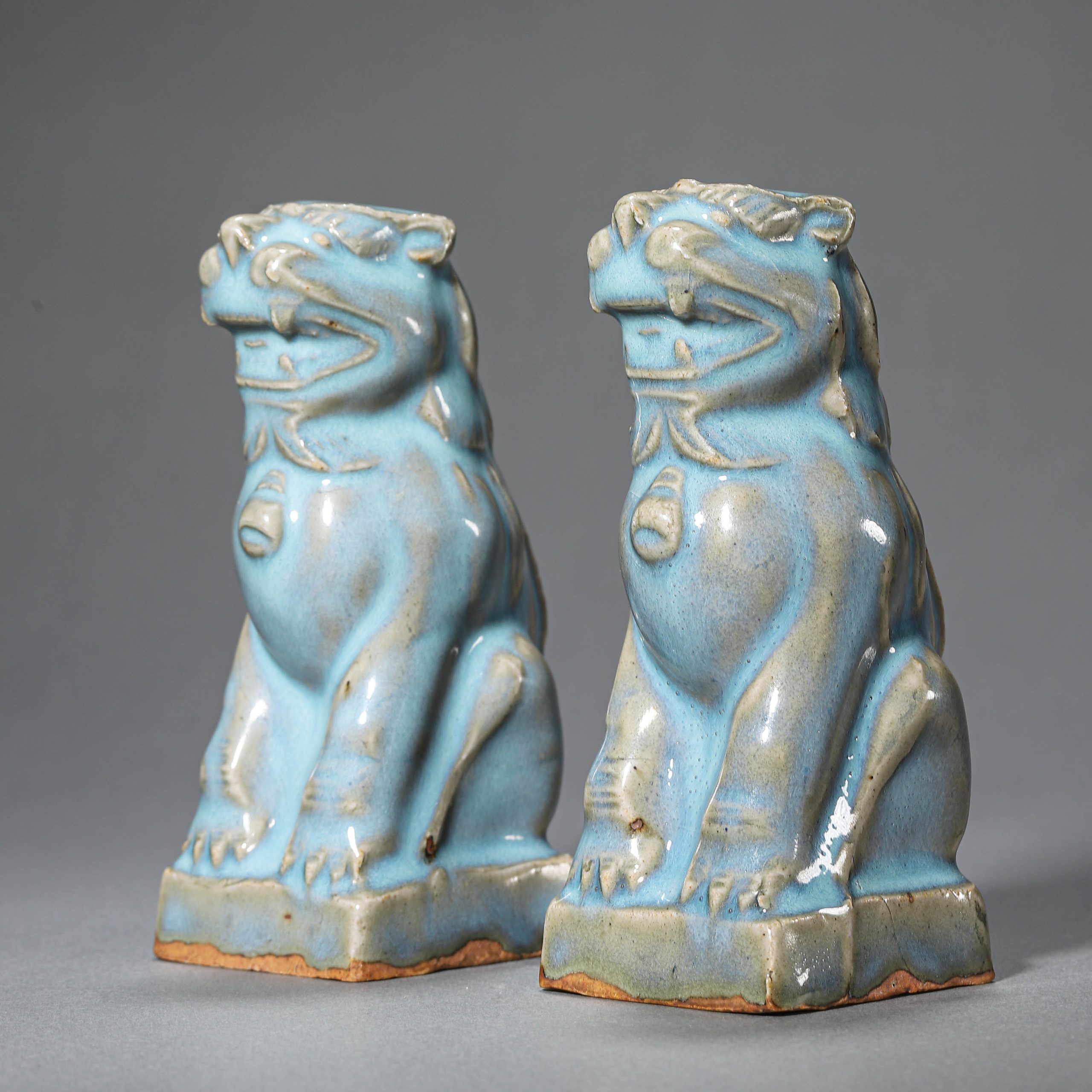 A PAIR OF CHINESE SONG DYNASTY JUNWARE LION FIGURES, POSSIBLY 10TH–13TH CENTURY.